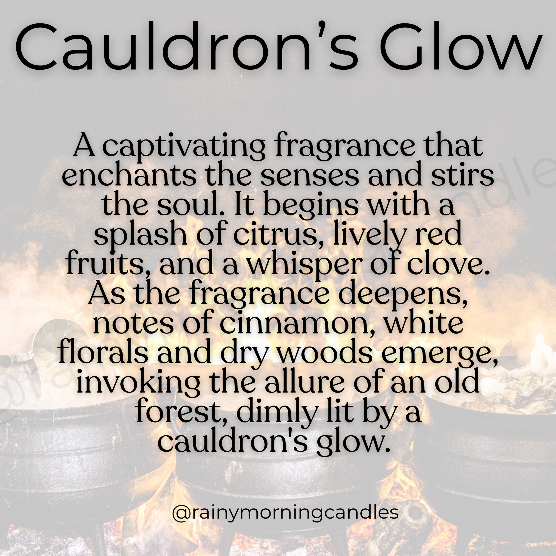 A captivating fragrance that enchants the senses and stirs the soul. It begins with a splash of citrus, lively red fruits, and a whisper of clove. As the fragrance deepens, notes of cinnamon, white florals and dry woods emerge, invoking the allure of an old forest, dimly lit by a cauldron's glow.
